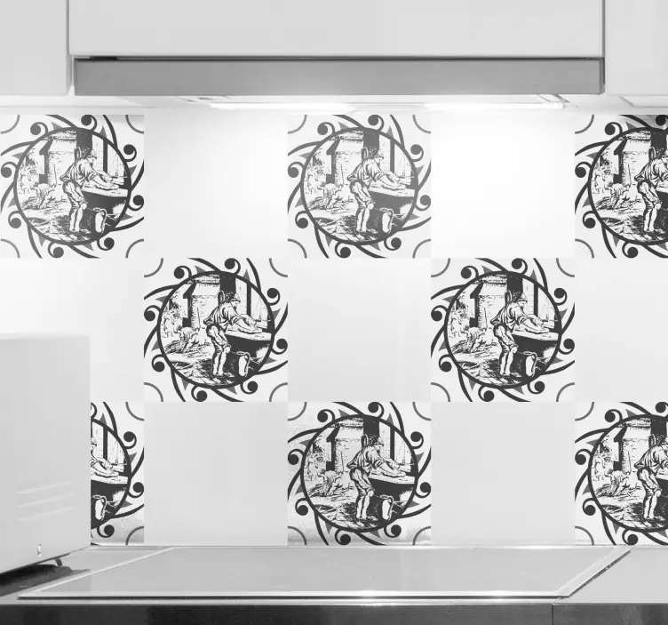 Referanse:: A52160Dette designet har et vintage håndverksmotiv, som viser en kunstner som arbeider flittig ved et bord, omgitt av surrende dekorative elementer. De intrikate detaljene fanger en følelse av nostalgi og kunstnerisk uttrykk, noe som gjør det til et iøynefallende tillegg til ethvert rom.