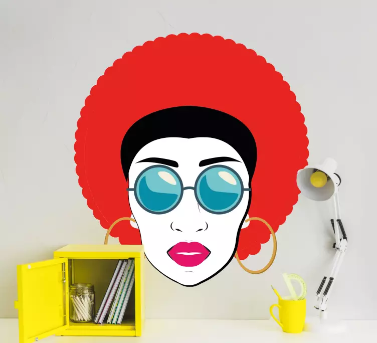 Referanse:: A48099En slående fremstilling av en kvinne med en overdimensjonert afrofrisyre, som fullfører et moteriktig utseende med solbriller og hoop-øreringer. De livlige fargene fremkaller en følelse av selvtillit og feiring, og legemliggjør en dristig stil som fanger oppmerksomhet.