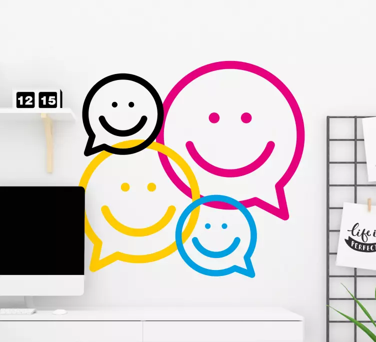 Referanse:: A49042En leken samling av smilefjes i forskjellige størrelser og farger representerer glede og kommunikasjon. Disse glade ikonene, stilisert med talebobler, vekker følelser og skaper en livlig atmosfære, perfekt for rom som har som mål å inspirere til positivitet.