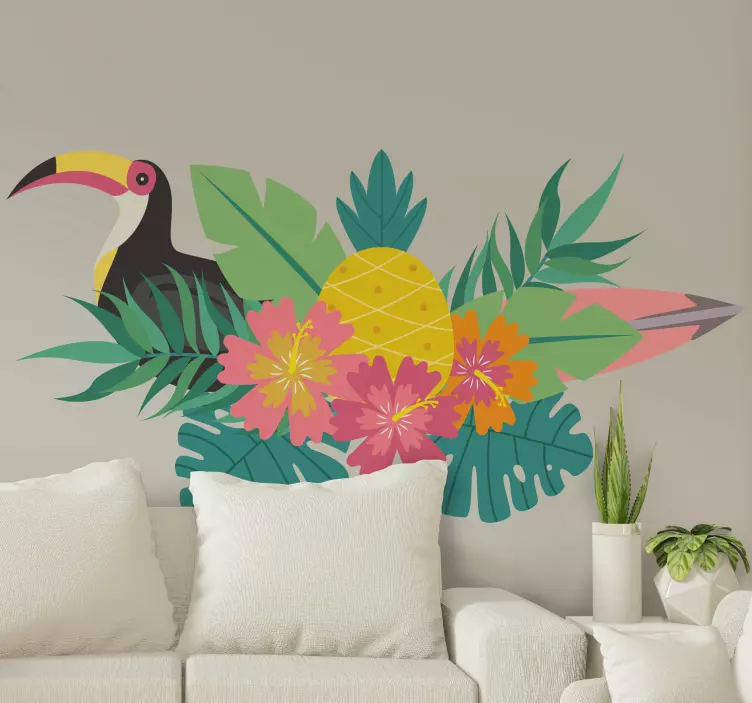 Referanse:: A48101Med en livlig tukan blant frodig grønt, fanger dette designet essensen av en tropisk atmosfære. En lys ananas og fargerike blomster gir et livlig preg, og skaper en forfriskende visuell opplevelse som er perfekt for å heve ethvert rom med en eksotisk stil.