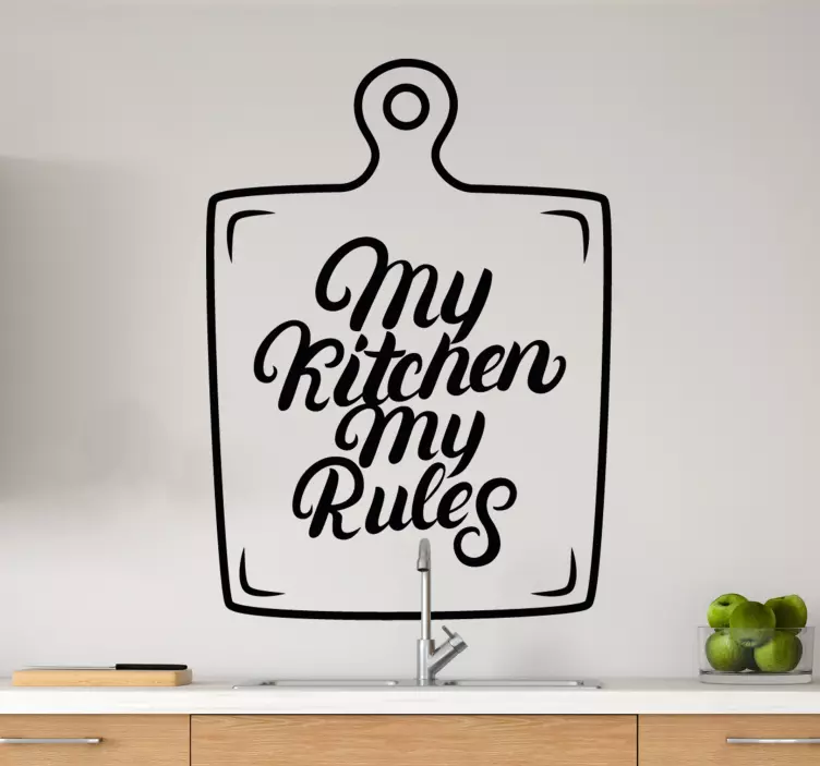 Referanse:: A50665En livlig uttrykk for matentusiaster, med frasen 'My Kitchen My Rules.' Dette iøynefallende designet gir et personlig preg til kjøkkenrom, fremmer kreativitet og kulinarisk frihet.