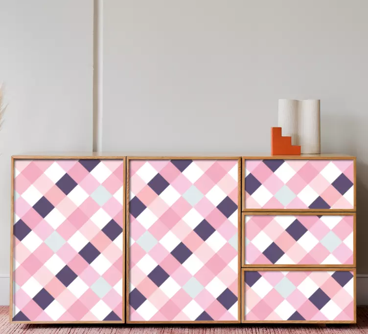 Referanse:: A51600En livlig og moderne overflate med et lekent mønster av sammenflettede geometriske former i myke rosa og marineblå toner. Dette allsidige designet tilfører et snev av modernitet til ethvert rom, noe som gjør det til et perfekt valg for å forbedre interiørstemningen.