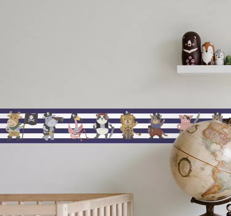 Referanse:: A47219En livlig samling av pirat-tema dyrekarakterer vist i lekne posisjoner. Hvert dyr har på seg forskjellige pirattilbehør, noe som skaper en herlig og eventyrlig atmosfære perfekt for barnerom. Designet har striper, noe som tilfører et stilig maritimt element til det overordnede temaet.