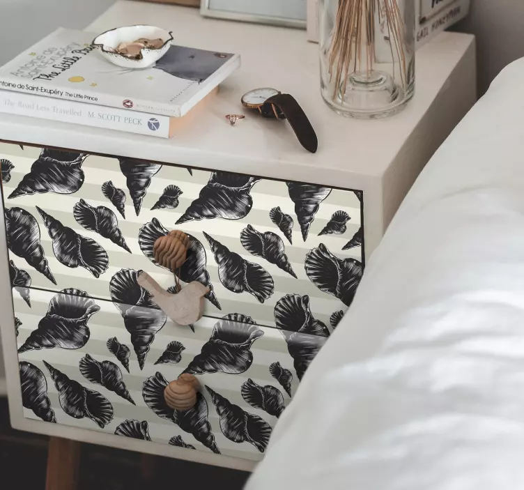 Oppdag vårt unike klistremerke dyr skjellmønster som kombinerer grafisk eleganse med naturens skjønnhet. Designet inneholder fascinerende møbler, skall og sjøskjell med striper og mønstre i svart og hvitt. Dette klistremerket gir en elegant touch til din hjemmedekorasjon og forvandler ethvert rom til et stilfullt fristed.