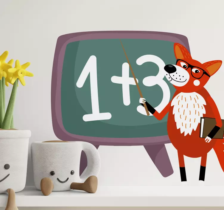 Referanse:: A50989En sjarmerende rev-karakter står ved en tavle og lærer lekende en enkel matteoppgave. Dette engasjerende designet har livlige farger som skaper et morsomt læringsmiljø, perfekt for barnerom. Reven, utstyrt med en peker og en bok, inviterer til nysgjerrighet og entusiasme hos unge lærende.