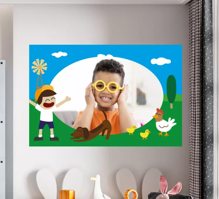 Oppdag vårt fantastiske klistremerke for barn lekende bondegårdscene, designet med fargerike og snodige tegneserieelementer som gir en livlig atmosfære til ethvert rom. Dette produktet inkluderer søte dyr og en liten gutt som utforsker gården, alt innrammet i et lekent bilde som garanterer moro for barna. Den unike grafiske utformingen gjør dette klistremerket til et perfekt tillegg i barnerommet, og gir en koselig, kreativ plass for lek og læring.