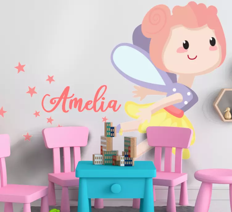 Referanse:: A48618Et lekent karakterdesign som viser en eventyrlig fe med fargerike vinger og et muntert uttrykk. Den tilpassbare aspekten gir en personlig touch, noe som gjør den ideell for et barns rom. Delikate stjerner følger karakteren for å forsterke dens fortryllende appell.