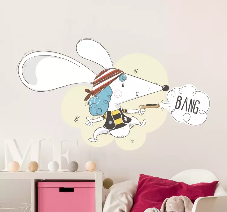 Referanse:: A47215En leken tegneserieillustrasjon av en mus kledd som en pirat, komplett med en stripete hatt og blått hår. Den fantasifulle karakteren holder en leke og utbryter 'BANG', noe som tilfører en følelse av moro og eventyr, perfekt for barnerom.