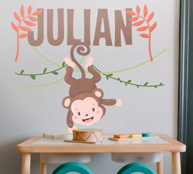 Referanse:: A49357Et sjarmerende design med en søt ape som henger opp ned fra en vinstokk. Designet inkluderer fargerike blader og et alternativ for personlig tilpasning, noe som gjør det perfekt for barnerom. Den lekne uttrykksformen til apen gir et gledelig preg til ethvert miljø.