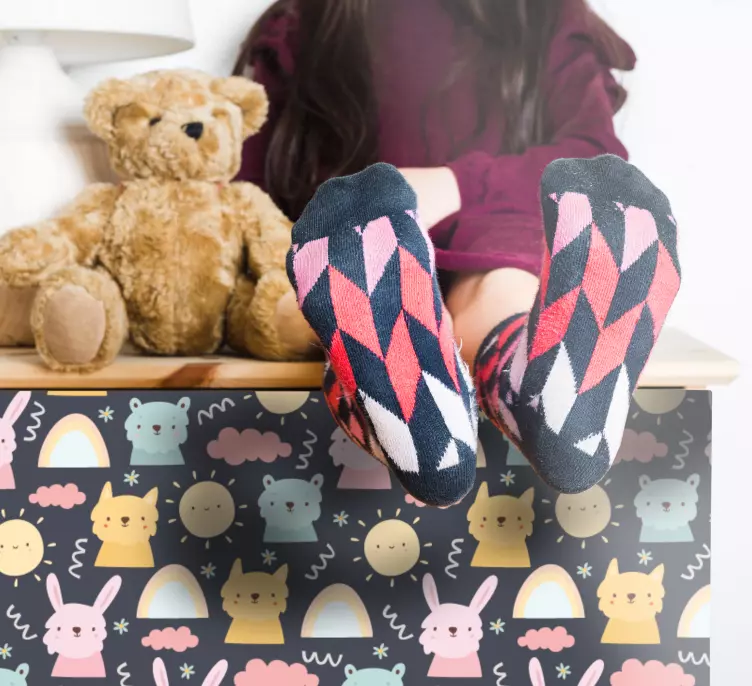 Referanse:: A51583Et leken design med en rekke søte dyrefigurer, glade skyer og soler. Kombinasjonen av pastellfarger og fantasifulle elementer gjør det til et perfekt valg for barnerom, og skaper en glad og innbydende atmosfære.