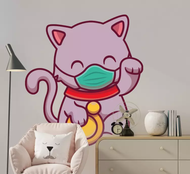 Referanse:: A48967En glad katt er avbildet med en beskyttende maske, som viser en leken karakter. Designet fremhever kattens livlige farge og runde trekk, og gir et lekent preg. Denne fremstillingen understreker glede og motstandskraft i utfordrende tider, og fanger en lettsindig følelse.