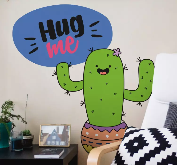 Referanse:: A46921En glad kaktuskarakter med et vennlig smil, prydet med en livlig blomst og en fargerik potte. Den har en leken taleboble med teksten "encouraging hugs", som gir et lettsindig preg til det samlede designet.