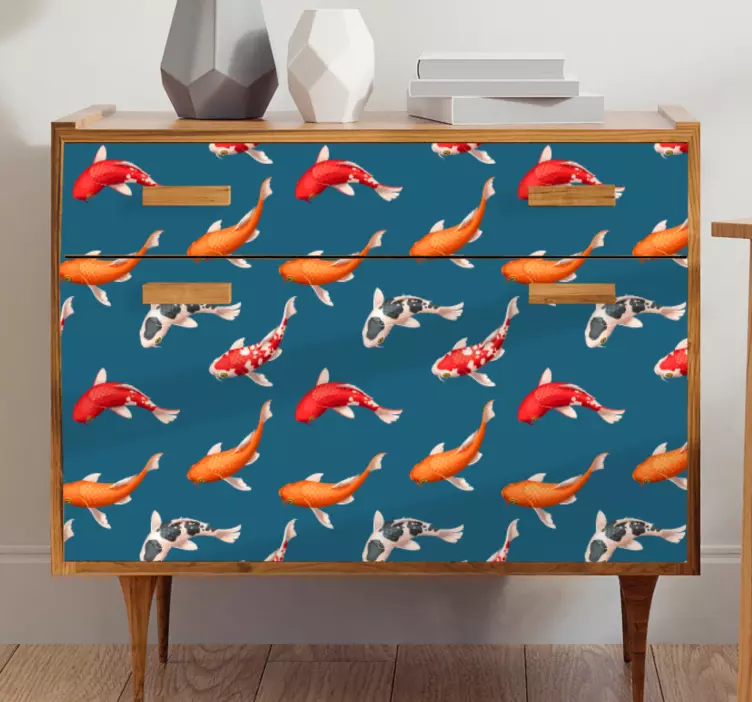 Oppdag vårt klistremerke møbler fargerike koi fisk, et unikt design som kombinerer grafisk kunst med naturens skjønnhet! Med motiver av fisk og fisker, skaper dette mønstret en livlig atmosfære i ethvert rom. De fargerike elementene gir en frisk følelse til dine møbler, og bringer naturen inn i hjemmet ditt på en kreativ måte.