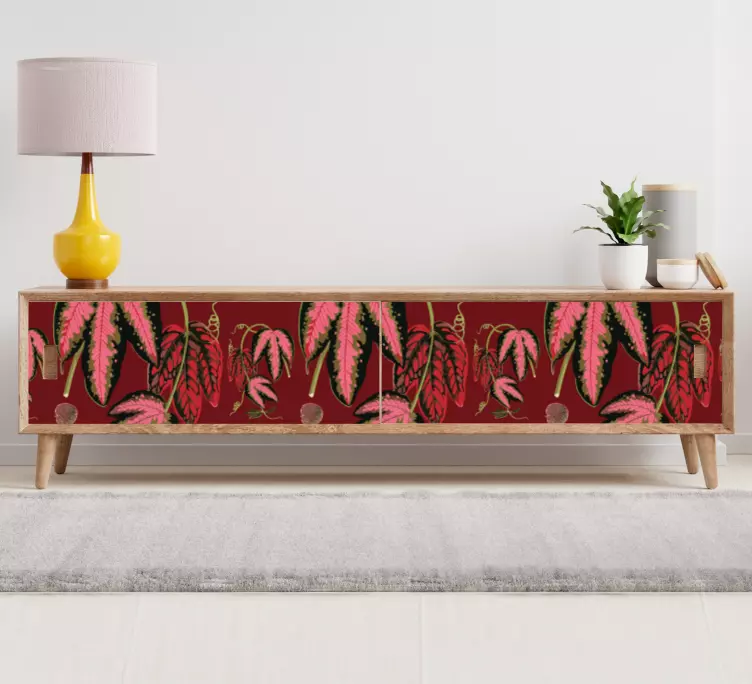 Oppdag det unike klistremerke møbler frodig bladmotiv med et grafisk design som fanger essensen av naturlig skjønnhet. Dette klistremerket kombinerer elementer som maranta, møbler, og flora i en levende illustrasjon. Fargene i rød, grønn, og rosa gir et friskt og floral preg som forvandler ethvert rom til et oase av stil.