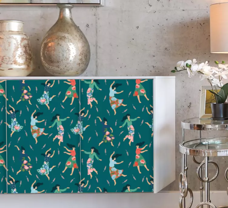 Oppdag vårt unike Klistremerke møbler gledefull bevegelsesmønster, som kombinerer en grafisk design med kvinner i dans, fargerike figurer og dynamiske mønstre. Dette abstrakte klistremerket feirer bevegelse og liv, og tilfører et friskt pust til ethvert rom. La møblene dine fortelle en historie med dette fantastiske designet!
