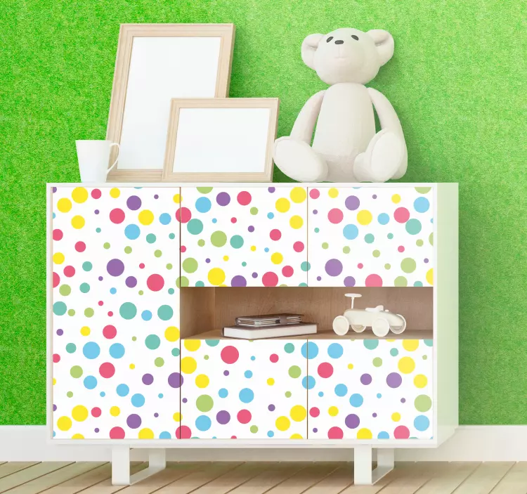 Oppdag vårt klistremerke møbler i livlig prikkemønster, et fargerikt og leken design som forvandler ethvert rom! Med geometriske former og sprudlende farger gir dette klistremerket liv til møblene dine. Det er perfekt for dem som ønsker å skape en unik atmosfære med stil og kreativitet.