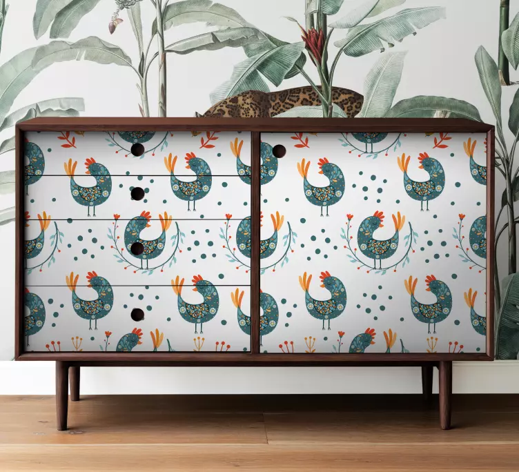Oppdag vårt fantastiske klistremerke møbler livlig hane illustrasjon, et unikt design som kombinerer kyllinger, dyr, møbler, mønster, floral kunst. Denne fargerike designen med lekne mønster vil gi liv til ethvert rom og skape en koselig atmosfære. La ditt hjem skinne med denne inspirerende og livlige illustrasjonen!