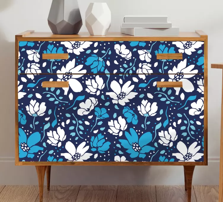 Oppdag vårt klistremerke møbler med blomstermotiv skuffer, som gir et unikt og grafisk preg til ethvert rom! Designet inkluderer vakre tusenfryd, blomster, og et naturlig mønster i blå og hvit som harmonerer perfekt med blader og natur. Dette florale designet vil forvandle dine møbler til en fristende oase av skjønnhet.