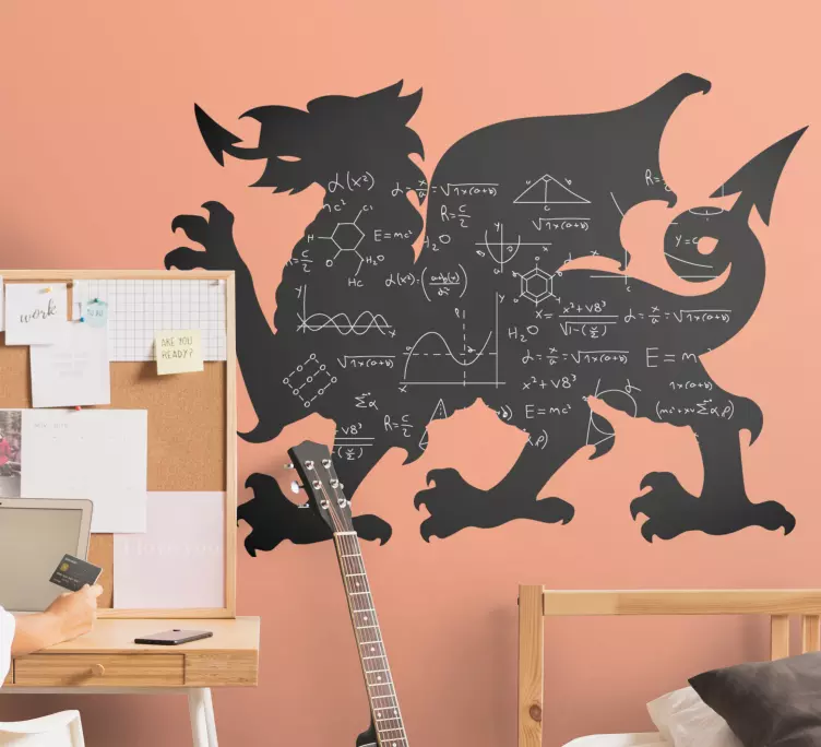 Referanse:: A51514Med en majestetisk dragesilhuett prydet med matematiske symboler og ligninger, blander dette slående designet fantasi og akademia. Den mytiske skapningen står som et kraftfullt emblem som representerer styrke og kunnskap, mens de intrikate detaljene gir et unikt preg til ethvert rom.