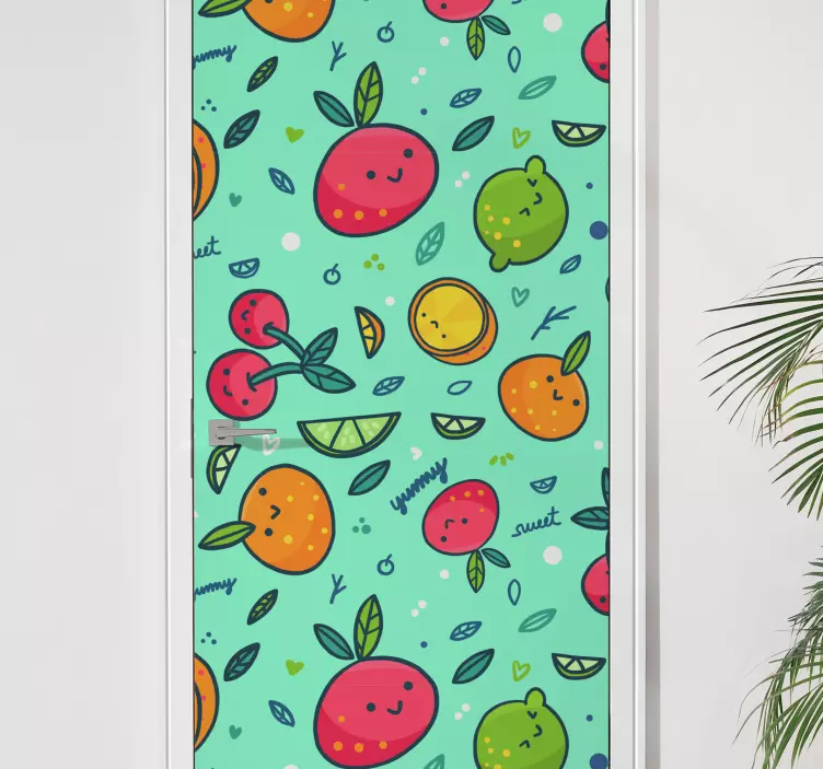 Dette vakre klistremerket er laget for å pryde kjøleskapsdøren din med et morsomt og livlig design av forskjellige fruktillustrasjoner. Dette designet vil gi døren din en unik og interessant stil som vil lysne opp hele rommet.
