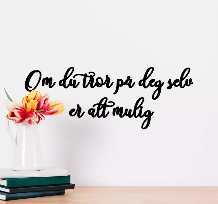 Gjør ethvert rom i hjemmet ditt mer inspirerende med våre motiverende sitat wallstickers. Disse selvklebende vinylskiltene er enkle å påføre og kan tilpasses i fargevalg, slik at du kan skape den perfekte dekorasjonen for ditt hjem. Enten du ønsker å legge til et nydelig preg på et soverom eller vil ha en motiverende påminnelse i stuen, våre sitat wallstickers vil hjelpe deg med å skape et rom som oser av positivitet.