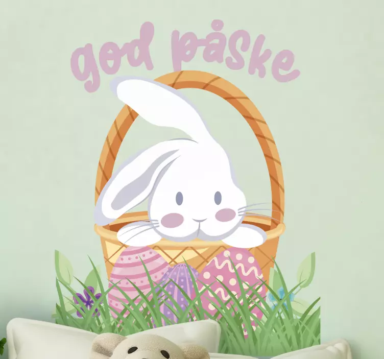Denne hvite påskeharen holder en kurv med egg mens den sitter i gresset og sprer påskestemning. Perfekt som dekorasjon for å pynte opp hjemmet ditt til påskeferien.