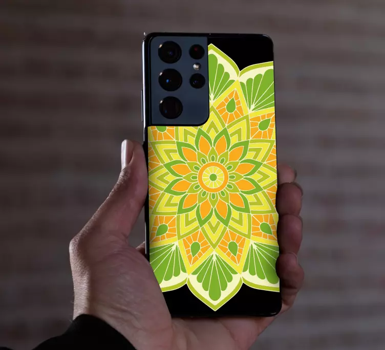 Referanse:: A53442Et levende blomster-mandala mønster som har intrikate geometriske former i nyanser av grønn, gul og oransje. Dette designet kombinerer naturlige elementer for å skape et harmonisk og iøynefallende utseende, perfekt for å forbedre ethvert personlig objekt.