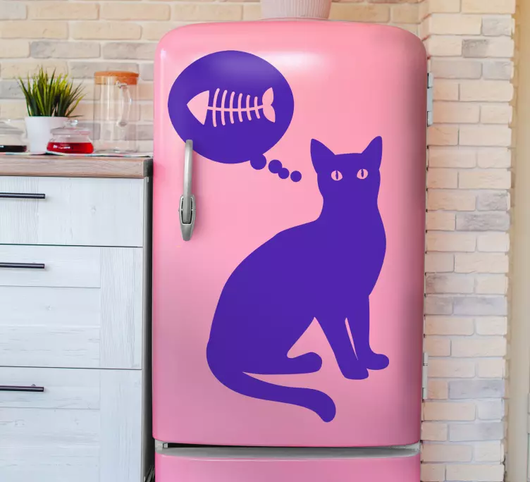 Oppdag vårt Tankefull katteprofil kjøleskap klistremerke, et unikt og grafisk design som fanger oppmerksomheten med sin morsomme katt silhuett og tankeboble. Dette kreative klistremerket viser en katt som tenker på fisk, perfekt for å gi kjøkkenet ditt en leken og personlig touch!