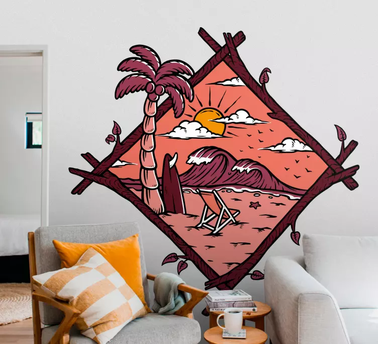 Oppdag vårt fantastiske Tropisk strandmotiv natur klistremerke som fanger essensen av en tropisk drøm! Designet er en kunstnerisk skildring av en ensom surfer som nyter bølgene under en magisk solnedgang, med palmer som svajer i vinden. Dette motivet gir deg en følelse av avslapning og frihet, perfekt for å forvandle ethvert rom til et tropisk paradis.