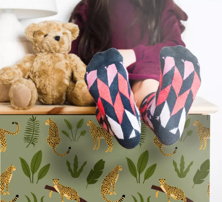 Oppdag det fantastiske designet av vårt Villdyr klistremerke leopardmønster jungel, som fanger essensen av dyrelivet i naturen. Med et unikt mønster av leoparder, blader og tropiske blomster, bringer dette klistremerket jungelens grønnfarge og liv til ethvert rom. Den flate overflaten og den vakre grafikken skaper en fargerik atmosfære, som gjør at dette produktet skiller seg ut blant møbler og interiørdekor.